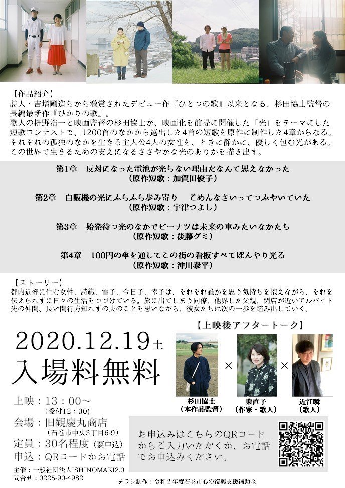 地方、映画、短歌、石巻、そして光。様々なキーワードから映画「ひかりの歌」を楽しんでいただけたら思いますので、皆様ぜひお気軽にお申込みください。