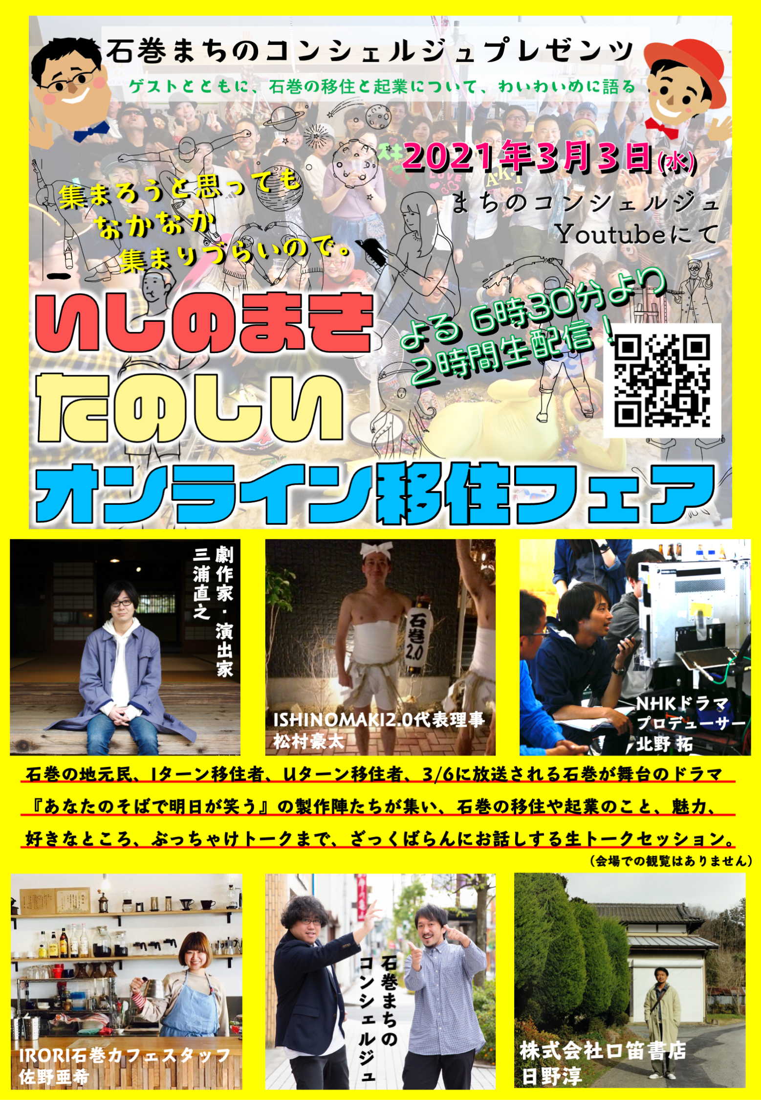 2021年3月3日(水)18:30より、石巻まちのコンシェルジュ企画のオンライン移住フェアを開催いたします。多彩なゲストとともに、石巻の移住と起業について語る「いしのまきたのしいオンライン移住フェア」です。
