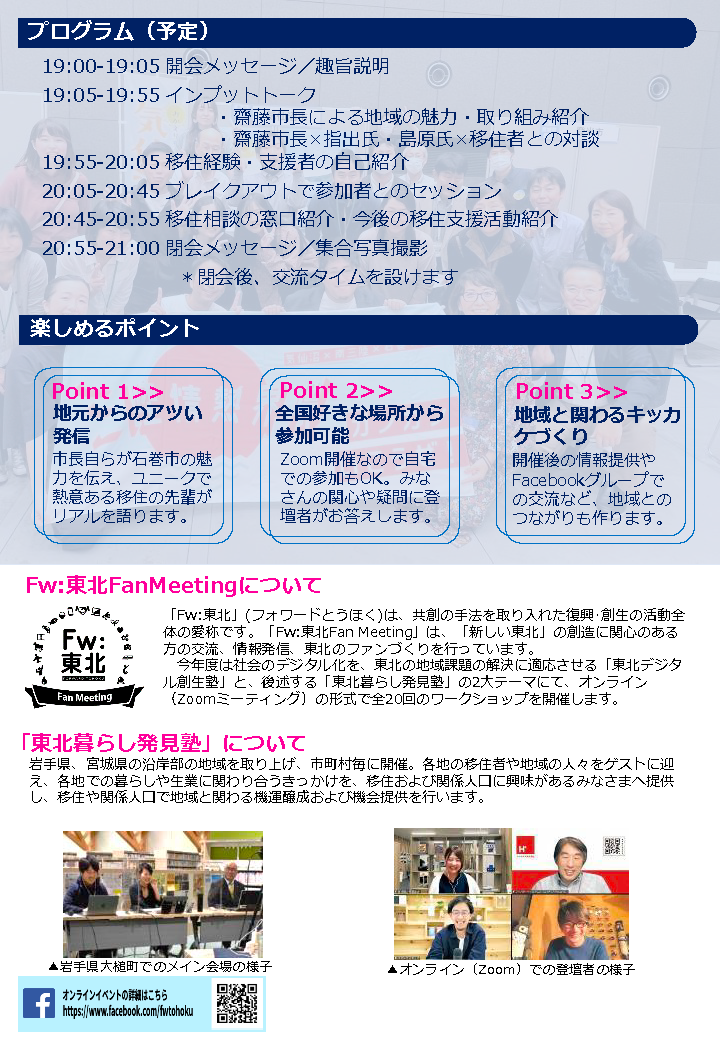こちらのイベントは、石巻市齋藤市長が地域の魅力を参加者に直接語りかけたり、石巻市に移住しさまざまなチャレンジをされている方の生の声を聞いたりして、参加者を交えて語り合える場となります。