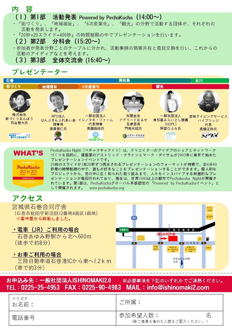 本家公認“ペチャクチャナイト”形式(ルールあり)でのプレゼンテーションを行う第一部。4テーマごとに分科会を行い、参加者全員が情報共有やアイディア交換などを行う場の第二部。地域団体紹介ブースでの交流会などもあり、進行役をISHINOMAKI2.0代表の松村が務めます。