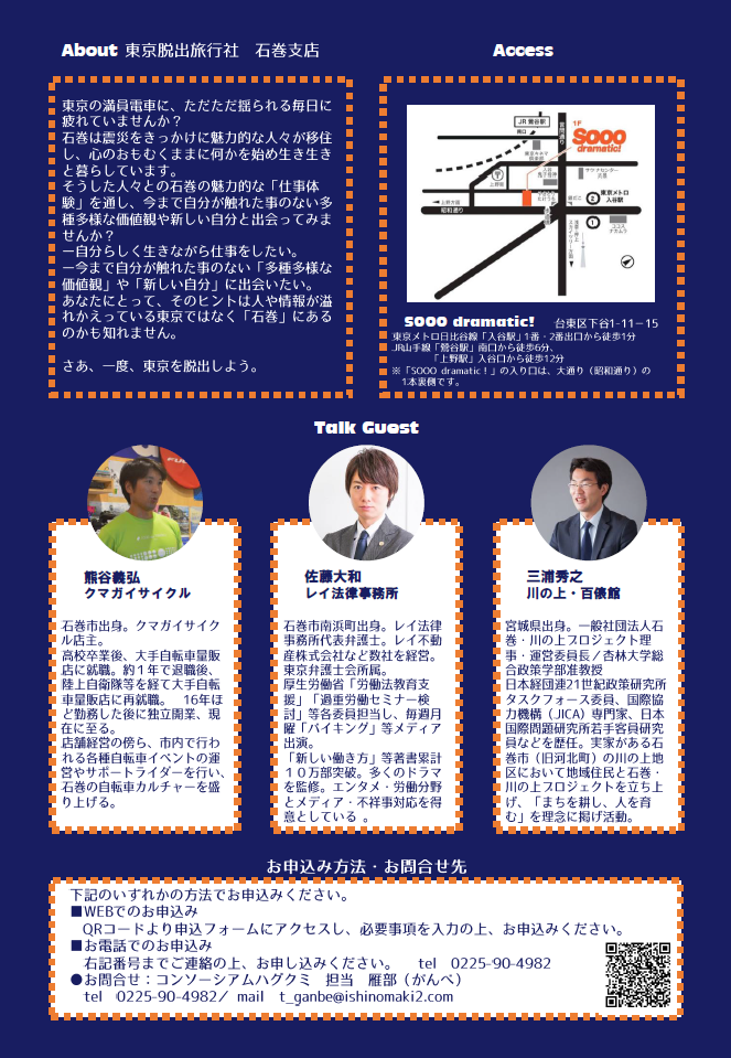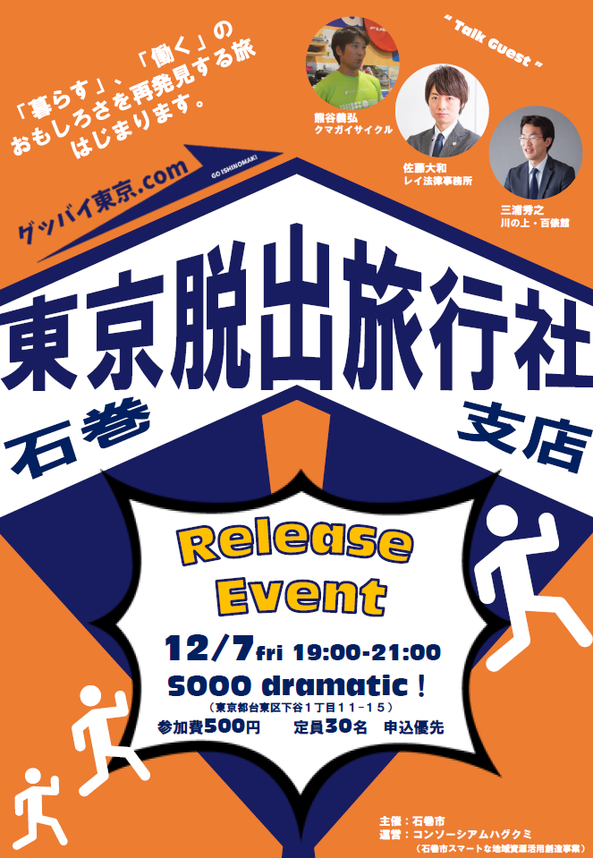 本プログラムのリリースイベントが東京・入谷の「SOOO dramatic!」を会場に開催されます。ゲストには石巻で働く、旅するおもしろさを伝えてくれるとっておきの3名をお呼びします。石巻の魅力に、そしてあなた自身のこれからの「暮らす」「働く」にワクワクしに来ませんか?