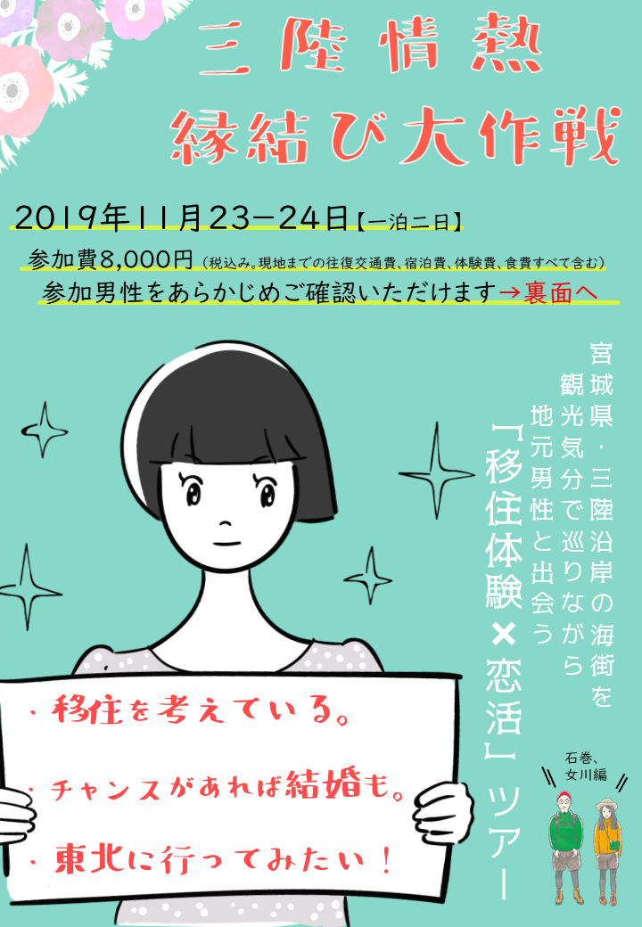 石巻市、気仙沼市、南三陸町、女川町が連携し、地域を越えて昨年度発足された移住やチャレンジを応援するこのチームが、今年の目玉企画として11月23日「恋活×移住ツアー」を開催いたします。