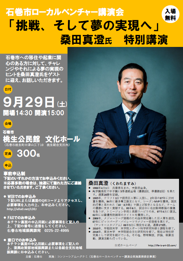 桑田氏はこれまで数々の講演をされてきましたが、どの内容もすばらしいと好評を呼んでいます。この講演会を機にベンチャー起業を立ち上げ、様々な挑戦を始めた人たちも少なくないとのこと。ご興味ある方はぜひお越しください。