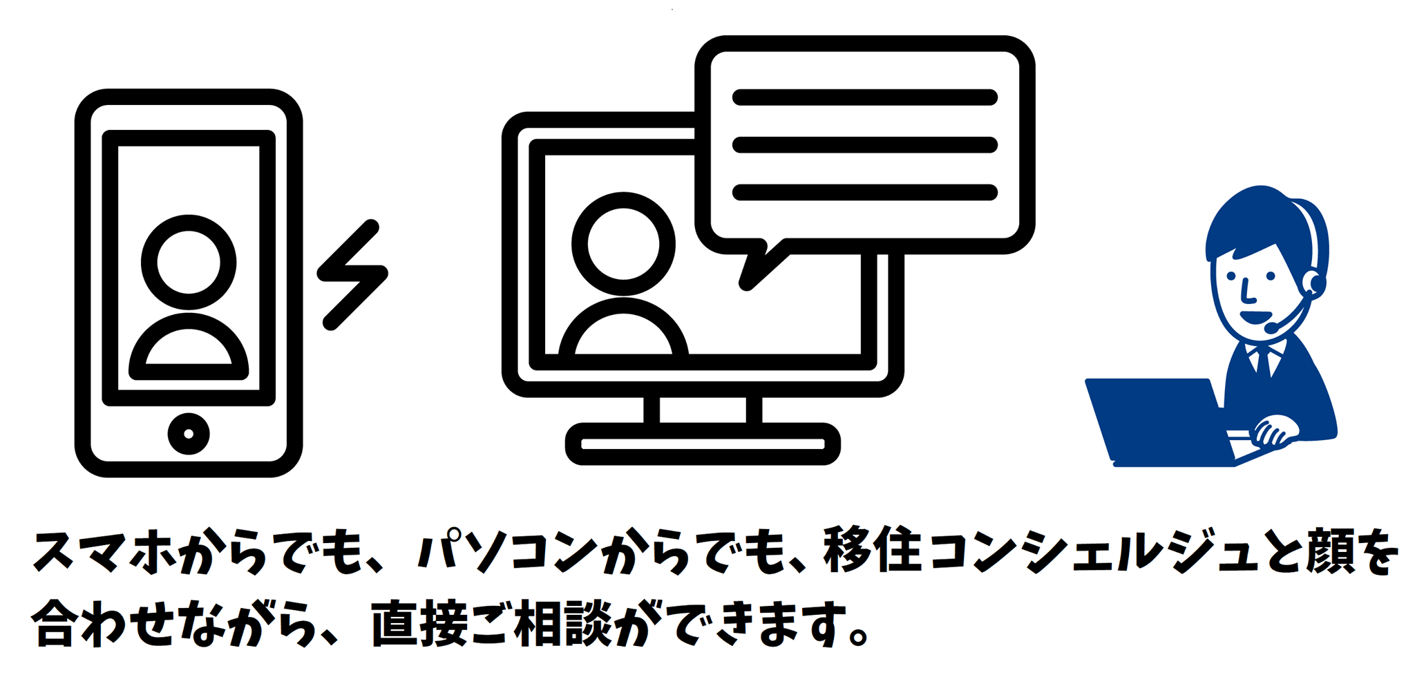 相談所に出向かず、パソコンやスマホ等で顔を合わせながらオンラインで移住に関する相談が可能です(月~金 10:00~19:00)。